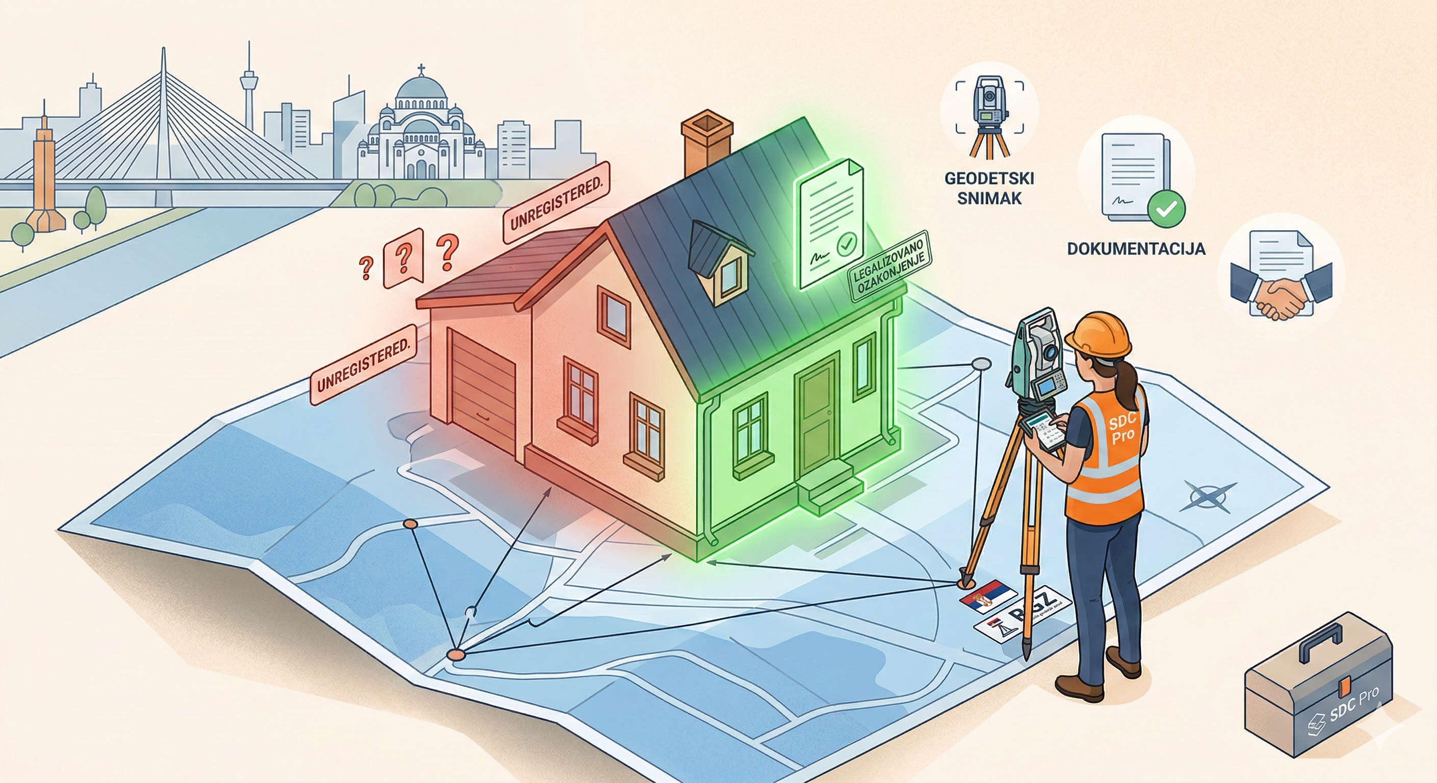 Zakon je jasan: Šta se mora prijaviti? Zakon o planiranju i izgradnji nalaže da se svaka dogradnja mora legalizovati (ozakoniti) ili raditi sa prethodno dobijenom građevinskom dozvolom. U oba slučaja, rad geodete je neizbežan. Da biste uopšte dobili dozvolu, potreban vam je katastarsko-topografski plan. A kada završite radove, taj novi, prošireni objekat se mora ponovo snimiti kako bi se “ubacio” u Katastar nepokretnosti umesto starog, manjeg objekta. Bez ovoga, vaša kuća pravno ne postoji u svom novom obliku.